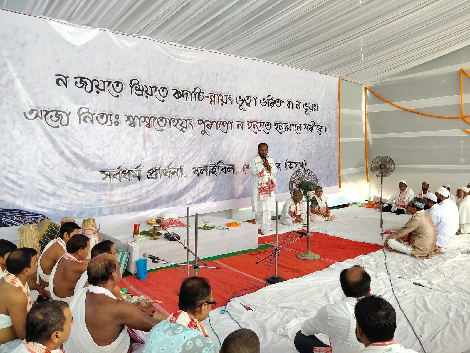 অসমীয়াৰ হিয়াৰ আমঠু শিল্পী জুবিন গাৰ্গৰ স্মৃতিত যোৱা ২৮ চেপ্তেম্বৰত জামুগুৰিহাটৰ ধলাইবিলত অনুষ্ঠিত এই সৰ্বধৰ্ম প্ৰাৰ্থনাত অংশগ্ৰহণ কৰে নদুৱাৰ সমষ্টিৰ বিধায়ক পদ্ম হাজৰিকাই। ধলাইবিল, বৰমতা আৰু এক নং বৰপথাৰ গাঁওৰ ৰাইজৰ উদ্যোগত অনুষ্ঠিত এই সৰ্বধৰ্ম অনুষ্ঠানত খোল প্ৰসঙ্গ, নাম প্ৰসঙ্গ, কোৰাণ পাঠ, খ্ৰীষ্টিয় প্ৰাৰ্থনা, বেংগলী সংকীৰ্তন, বৌদ্ধ প্ৰাৰ্থনা, পাল নামৰ আদিৰ আয়োজন হয় ৷ এই সৰ্বধৰ্ম প্ৰাৰ্থনা অনুষ্ঠানৰ শুভাৰাম্ভ কৰোতে চল্লিশটাকৈ দিন কন্যকাত জুবিন গাৰ্গৰ দৰে বহুমুখী প্ৰতিভাৰ অধিকাৰী শিল্পীগৰাকীৰ সান্নিধ্যৰ স্মৃতি ৰোমন্থন কৰি আৱেগিক হৈ পৰে বিধায়ক পদ্ম হাজৰিকা। শিল্পীগৰাকীৰ স্মৃতি চিৰযুগমীয়া কৰি ৰাখিবলৈ নদুৱাৰ সমষ্টিত এখন নাহৰৰ উদ্যান তথা এটি প্ৰতিমূৰ্ত্তি স্থাপনৰো সিন্ধান্ত গ্ৰহণ গ্ৰহণ কৰা হৈছে। অনুষ্ঠানত অঞ্চলটোৰ কেইবা শতাধিক বিভিন্ন ধৰ্ম্বালম্বী ৰাইজে স্বতঃস্ফূৰ্তভাৱে ওলাই আহি এই সৰ্বধৰ্ম প্ৰাৰ্থনাত অংশগ্ৰহণ কৰি শিল্পীগৰাকীক শ্ৰদ্ধাঞ্জলি জ্ঞাপন কৰি অনুষ্ঠানটো সাৰ্থক কৰি তোলাত অৰিহণা যোগায় ৷