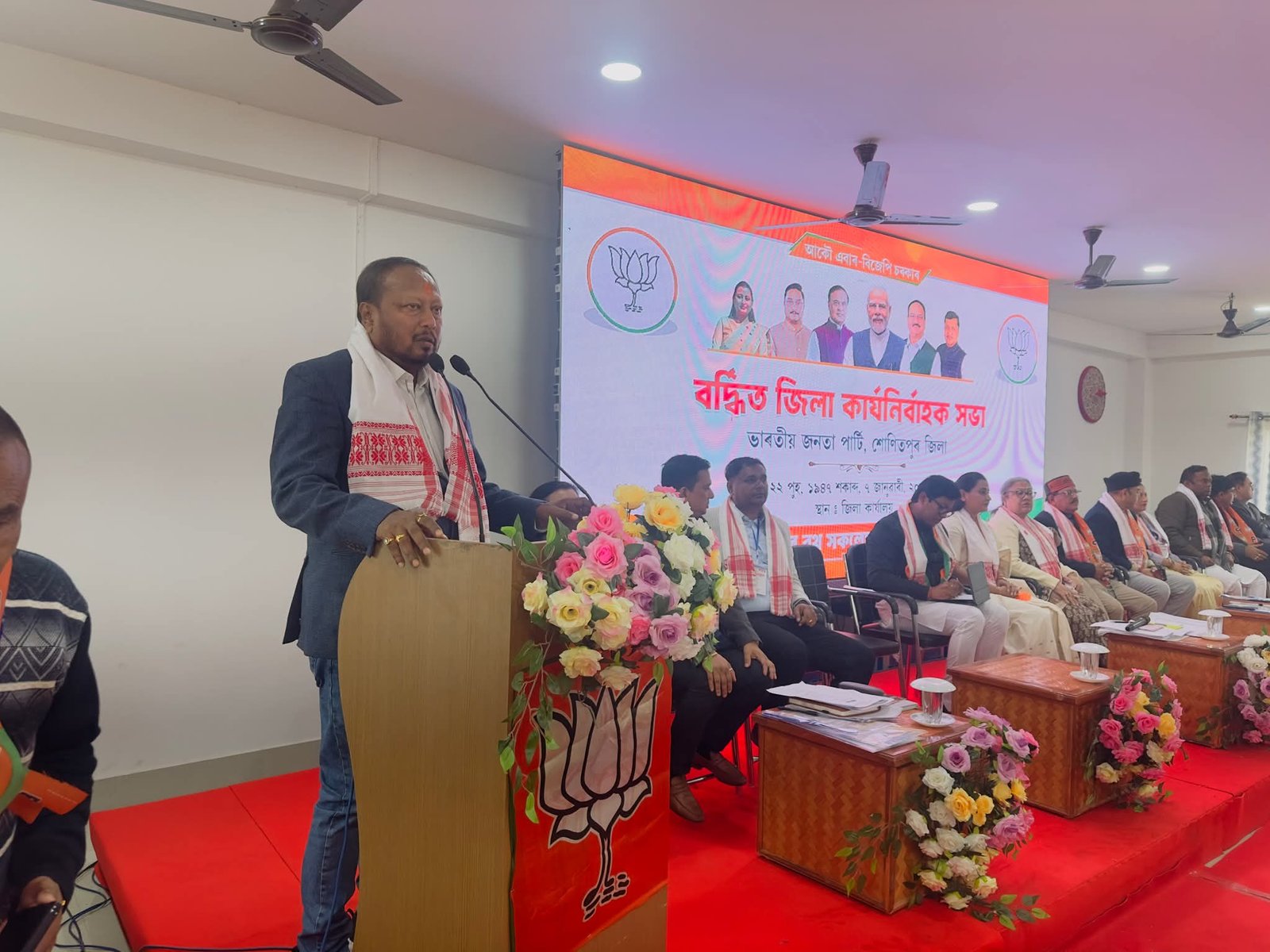 আজি বিজেপি দলৰ বৰ্দ্ধিত জিলা কার্য্যনির্বাহকখনি তেজপুৰস্থ জিলা কাৰ্যালয়ত অনুষ্ঠিত হয়। জিলা সভানেত্রী শ্রী মধুস্মিতা ডেকা হাজৰিকাৰ সভাপতিত্বত অনুষ্ঠিত সভাখনত নদুৱাৰ সমষ্টিৰ বিধায়ক পদ্ম হাজৰিকাই ৰাজনৈতিক প্রস্তাৱ উত্থাপন কৰে। ভাষণ প্রসংগত বিধায়ক গৰাকীয়ে মাননীয় প্রধানমন্ত্রী শ্রীযুত নৰেন্দ্র মোদী ডাঙৰীয়া আৰু মাননীয় মুখ্যমন্ত্রী শ্ৰীযুত হিমন্ত বিশ্ব শর্মাদেৱৰ নেতৃত্বত কেন্দ্রীয় চৰকাৰে আৰু ৰাজ্য চৰকাৰে গ্ৰহণ কৰা উন্নয়নমূলক পদক্ষেপসমূহ ব্যাখ্যা কৰে। তদুপৰি অসমত কংগ্রেছৰ চৰকাৰৰ সময়ত সৃষ্টি হোৱা দুর্যোগপূর্ণ অশান্ত পৰিৱেশ তথা ব্যাপক হিংসা-হত্যালীলা ঘটনাসমূহৰ অৱসান ঘটাই বিজেপি চৰকাৰে প্রতিষ্ঠা কৰা শান্তিৰ অসমত আজি বন্দুকৰ গুলীৰ শব্দৰ বিপৰীতে চৰাইৰ মাতত ৰাতিপুৱায় বুলি উল্লেখ কৰে। এই সভাত অসম বিধানসভা নিৰ্বাচনৰ বাবে দলে ৰাজ্যিক সহ-প্ৰভাৰী হিচাপে নিযুক্ত কৰা দৰ্শনা জৰদোশ ডাঙৰীয়ানীয়ে ৰাইজৰ সৈতে সম্পৰ্ক সুদৃঢ় কৰাৰ উপৰিও দলটোক আগন্তুক নিৰ্বাচনলৈ সাজু কৰি তুলিবলৈ দিয়া পৰামৰ্শসমূহো কাৰ্যকৰ্তাসকলৰ বাবে সহায়ক হ’ব। ভাৰতীয় জনতা পাৰ্টি, অসম প্ৰদেশ ৰাজ্যিক সাধাৰণ সম্পাদক শ্ৰীযুত পল্লৱলোচন ডাঙৰীয়াৰ সাৰগৰ্ভ বক্তব্যয়ো কৰ্মকৰ্তাসকলক আগন্তুক নিৰ্বাচনী যুঁজলৈ প্ৰেৰিত কৰে।